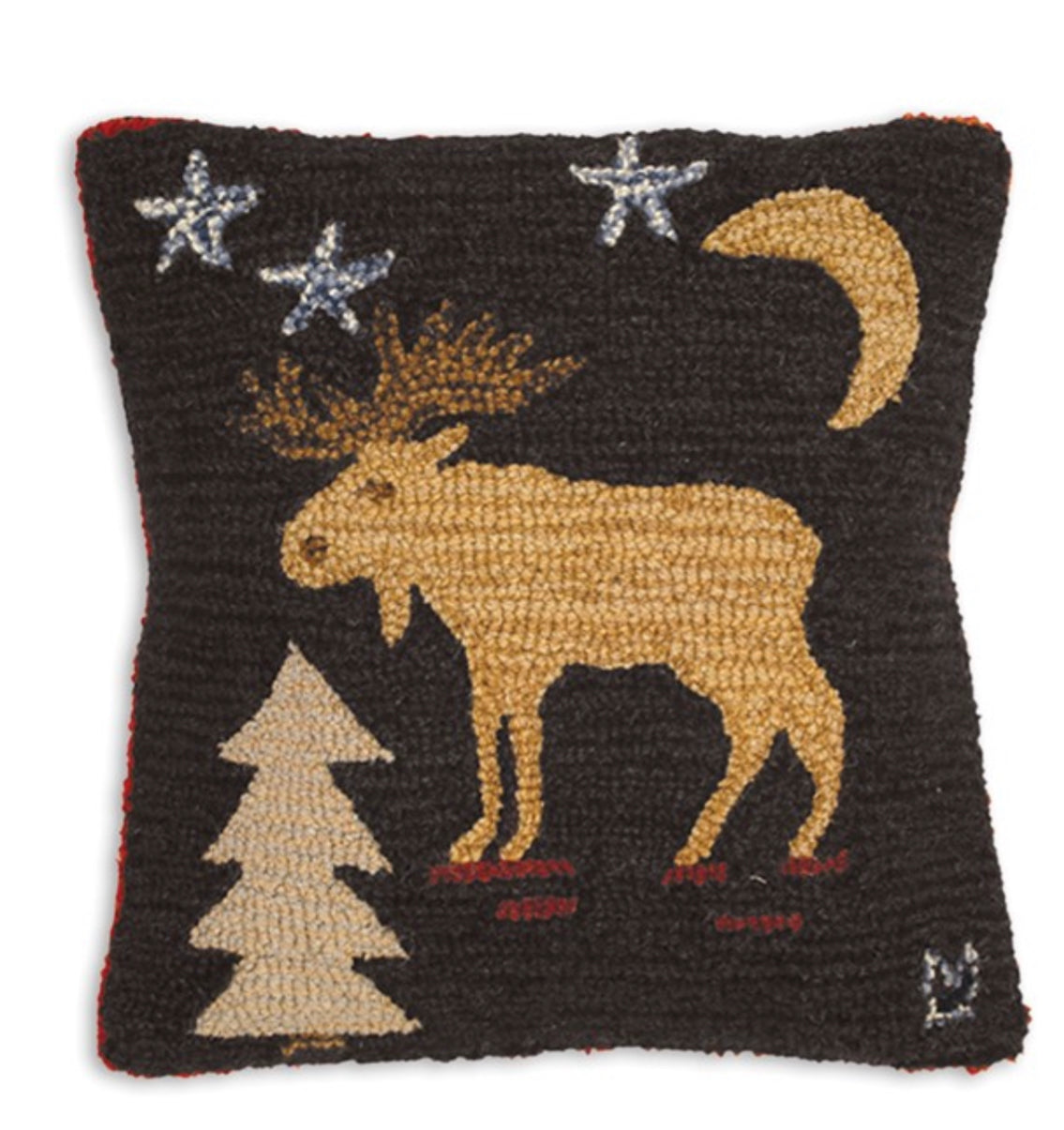 A common New England scene - a moose out on an evening stroll through the wilderness, and right into your cabin, lodge or country home. Designed in Vermont by Laura Megroz.