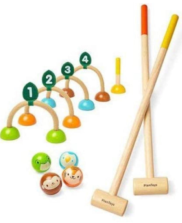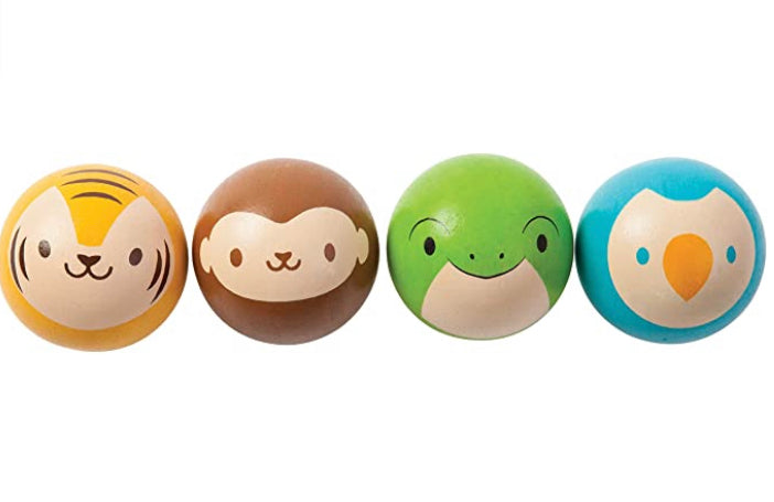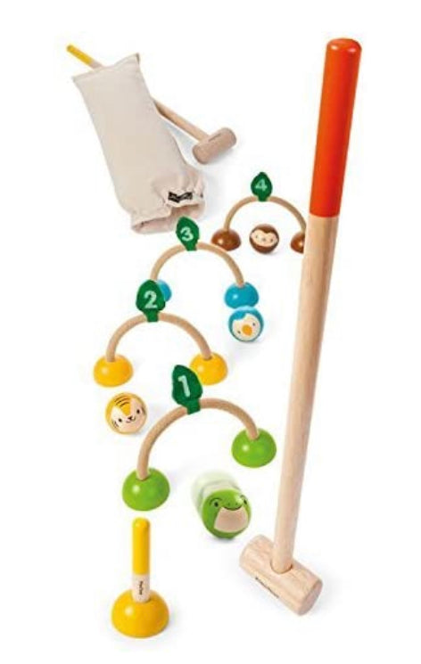 - The set includes 4 different animal wooden balls - bird, tiger, monkey and frog, 2 mallets, 4 wickets and a final stand; Bag included