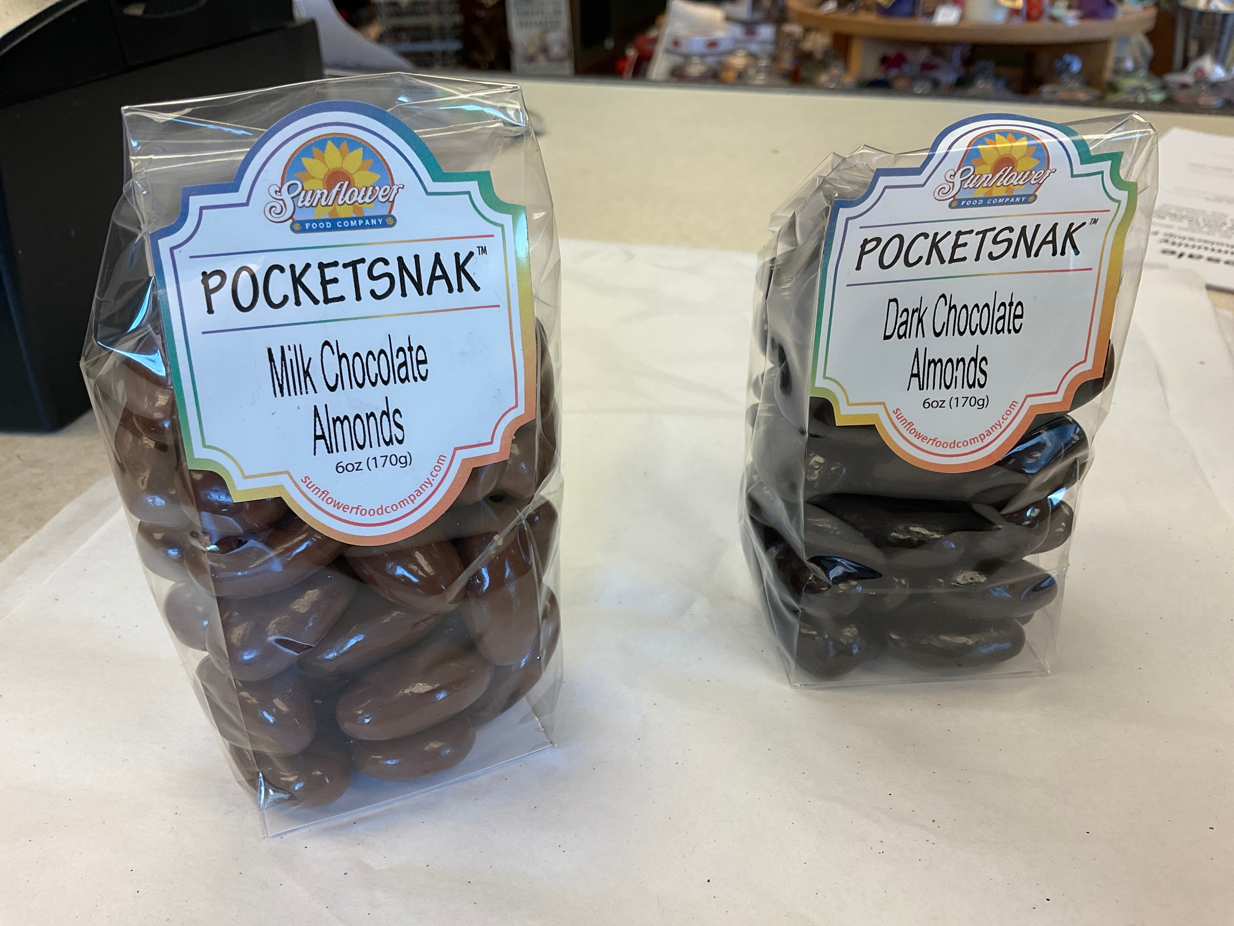 Our classic fold down bag we call our Pocketsnaks - Enjoy a nutty crunch with Milk Chocolate Almonds or Dark Chocolate Almonds. 6oz bag.