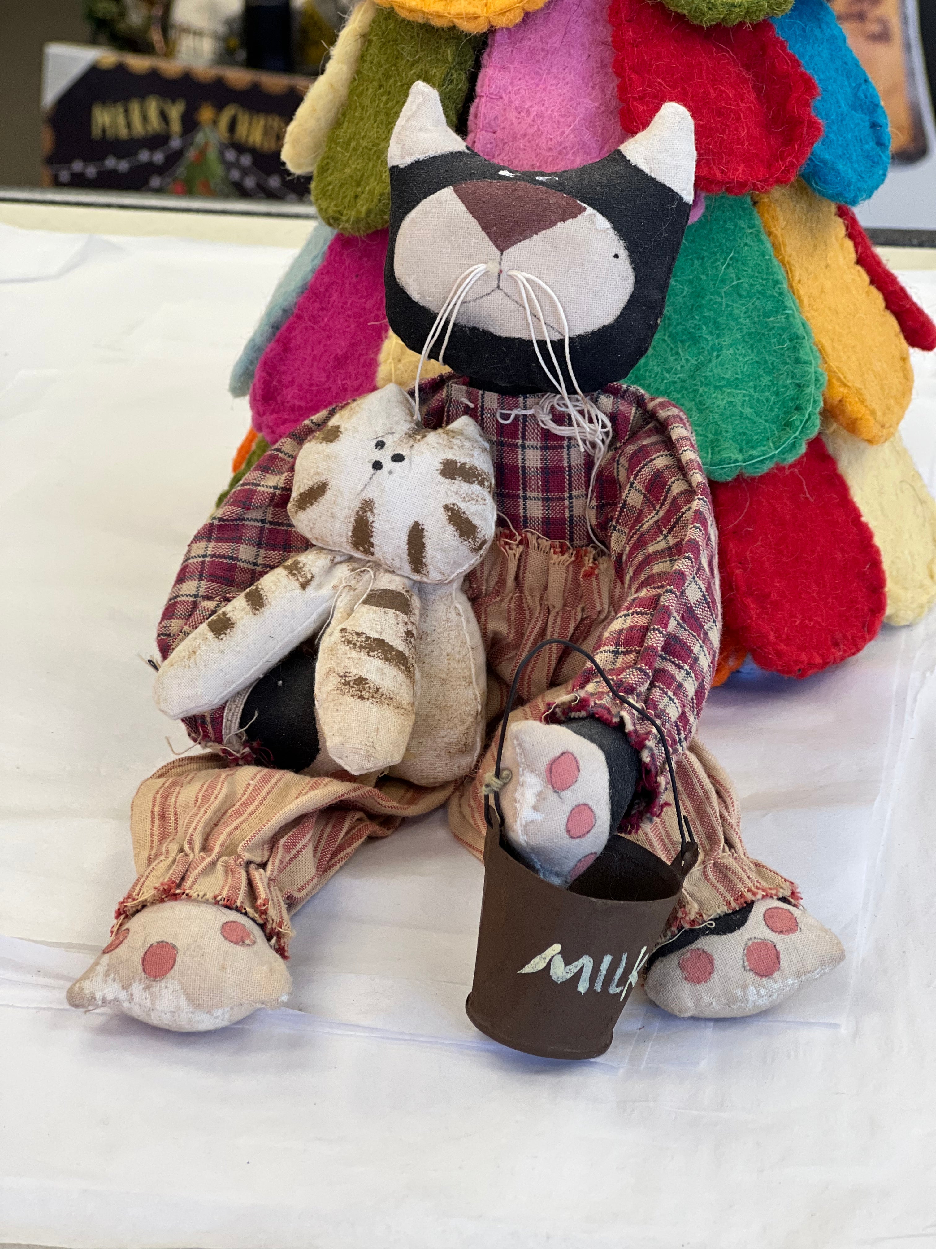 Cute Primitive rag doll Kitty holding a smaller kitty and a metal milk can. A cute shelf sitter. 12”