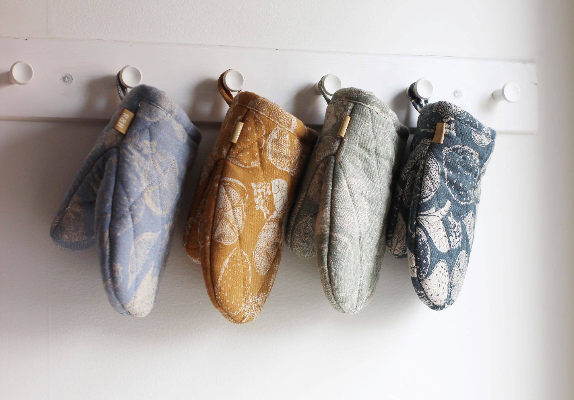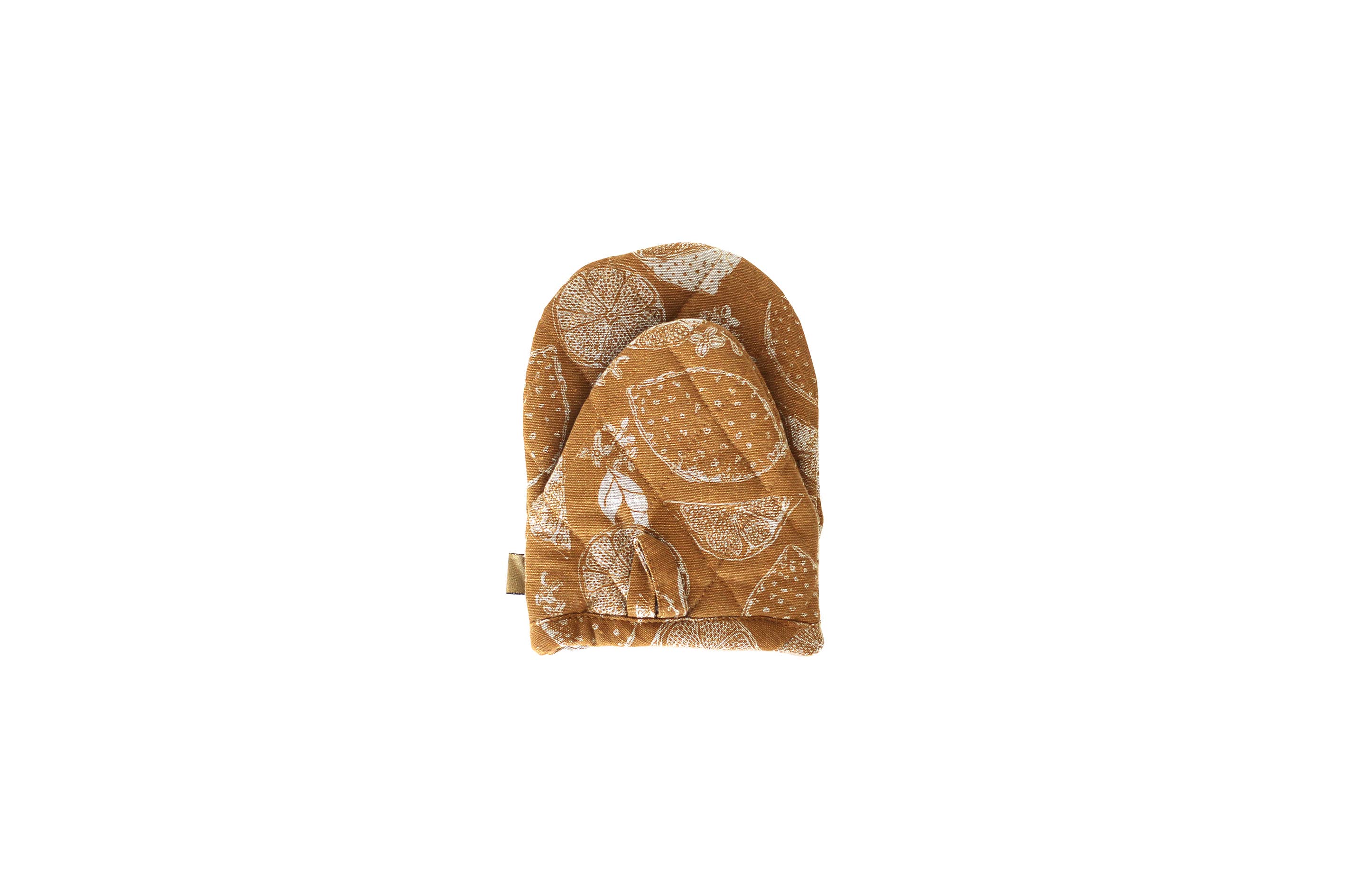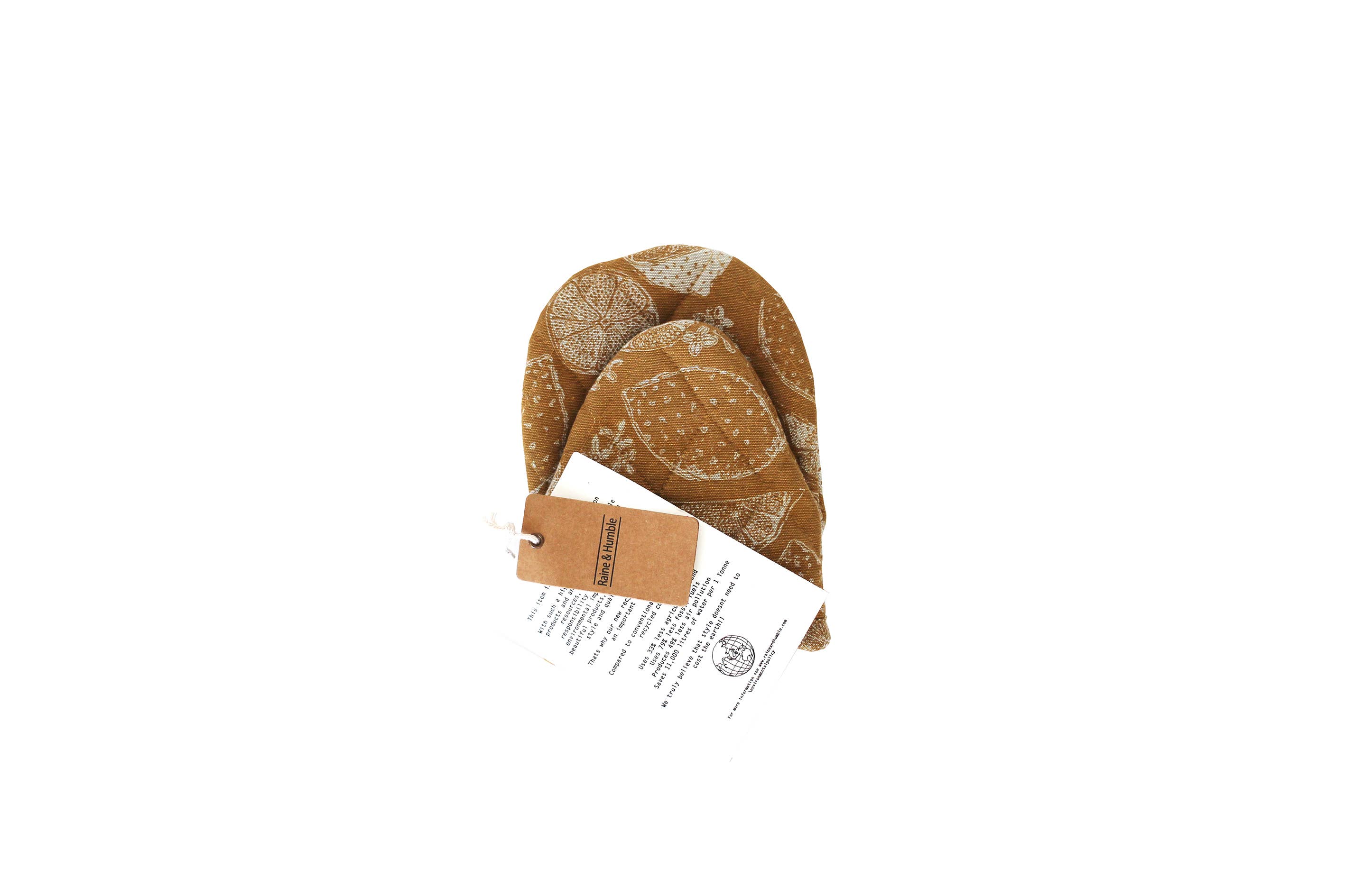 100% recycled fiber, quilted short oven glove featuring the Lemon Marmalade print with a contrasting thin stripe lining. Quilted for extra protection from the heat. Great for counter top cooking with micro waves, stove top, crock pots and air fryers. Includes a fabric hang tag for easy display.