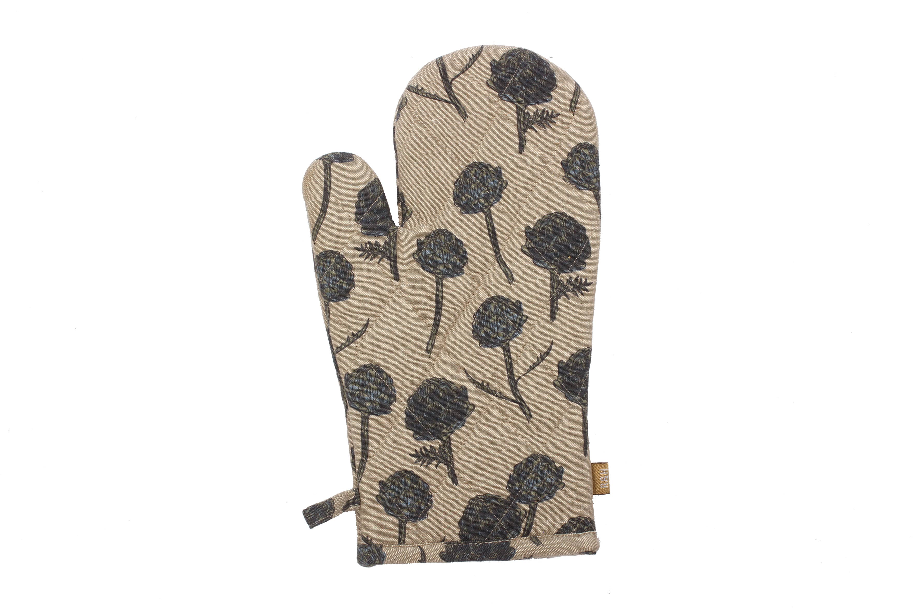 Quilted for extra protection from the heat, these oven gloves feature the Artichoke print in Dark Slate. A hook tab makes it easy to hang this glove for storage and display. Made of 100% recycled cotton with natural dyes. A great companion to the matching artichoke aprons and trivet/potholders, and totes.