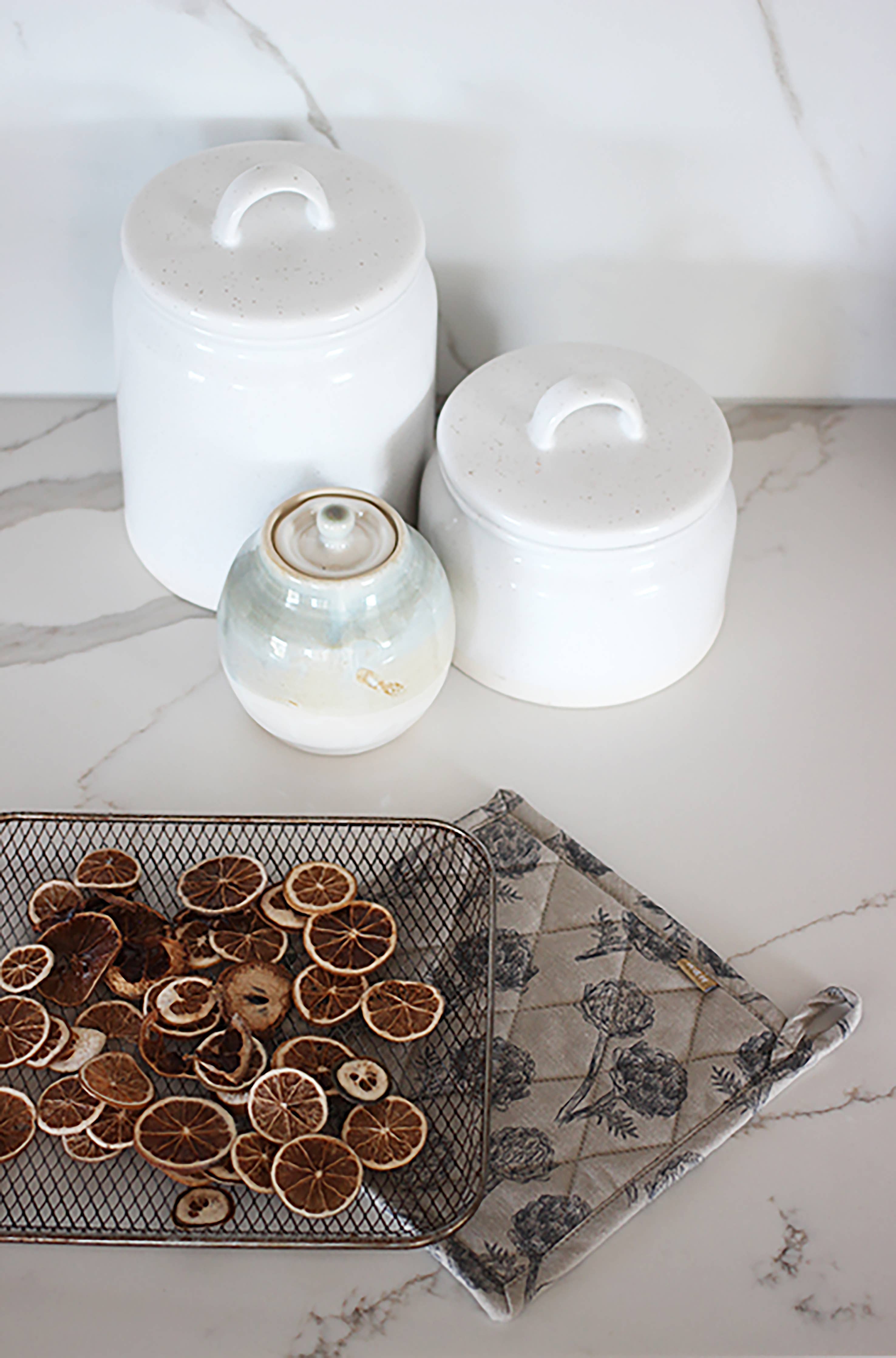 These potholders are quilted for extra protection from the heat. Protect your hands or the counter or tabletop from the heat. Printed with the Artichoke pattern in Charcoal. Includes a hanging loop for easy storage and display. Made of 100% recycled cotton and natural dyes. Pretty, functional, and eco-friendly.