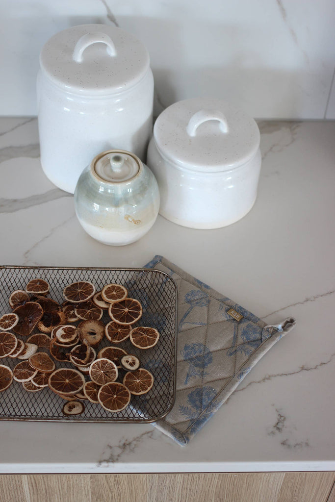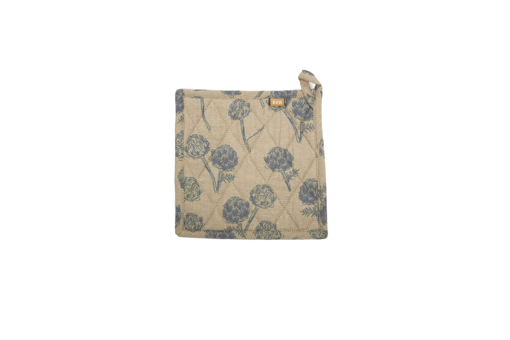 These potholders are quilted for extra protection from the heat. Protect your hands or the counter or tabletop from the heat. Printed with the Artichoke pattern in Dark Slate. Includes a hanging loop for easy storage and display. Made of 100% recycled cotton and natural dyes. Pretty, functional, and eco-friendly.