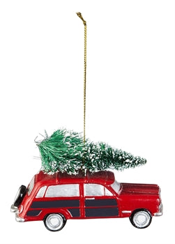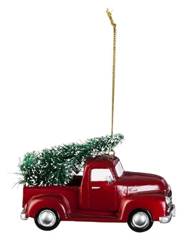 RED POLYSTONE TRUCK AND STATION WAGON ORNAMENT, 2 ASST