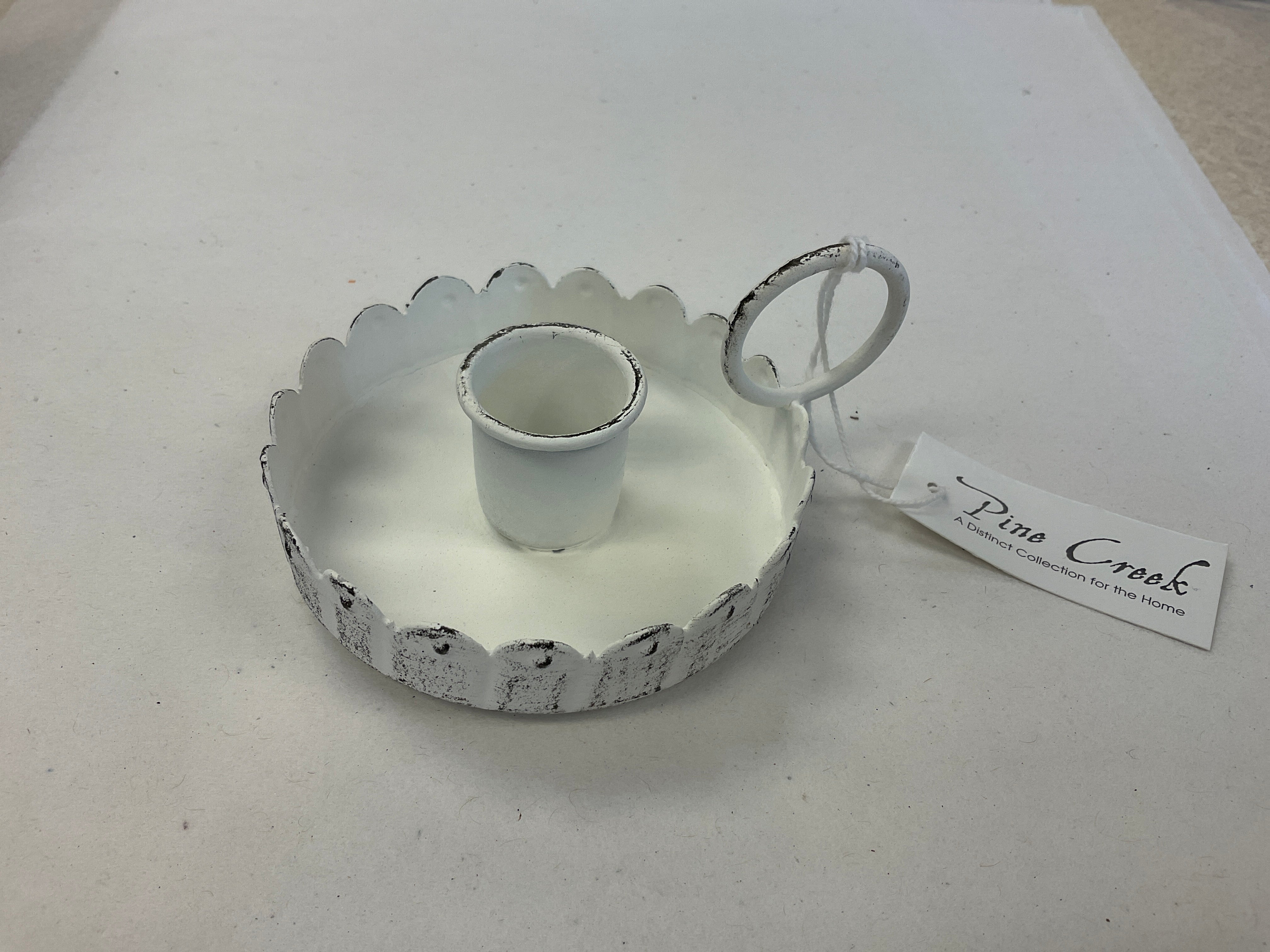 Antiqued White Scalloped Taper Holder is a simple metal accent that is perfect for a variety of taper holders. This candle holder has a fluted candle pan with a round loop handle and its flat base rests perfectly on shelves, counters, and side tables.