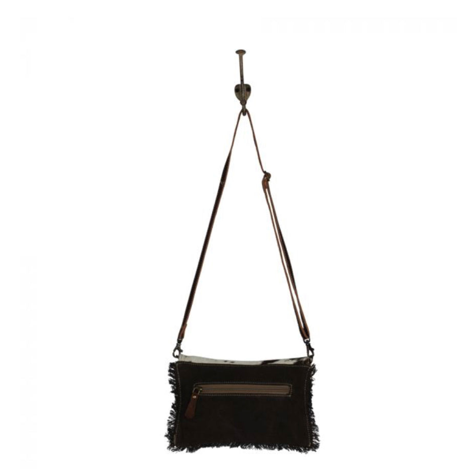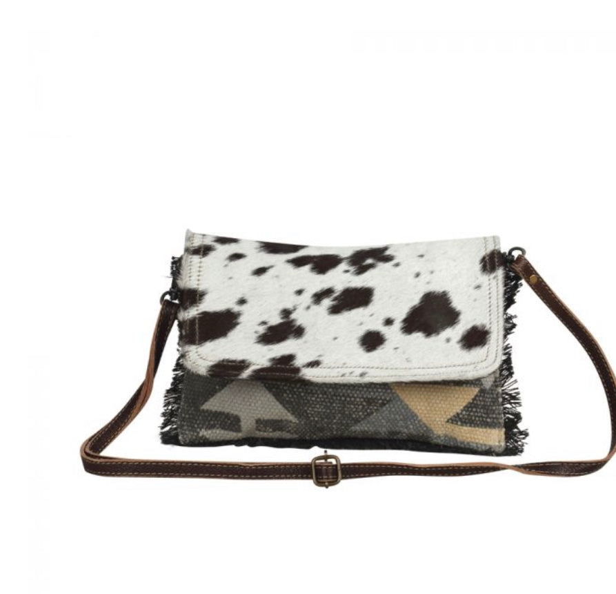 A perfect blend of hair on leather and a sturdy rug. The front flap not only makes it chic but also provides that much needed extra space. Adjustable leather straps and the recycled military tent makes it all the more durable.