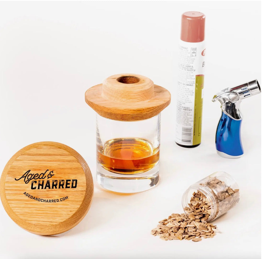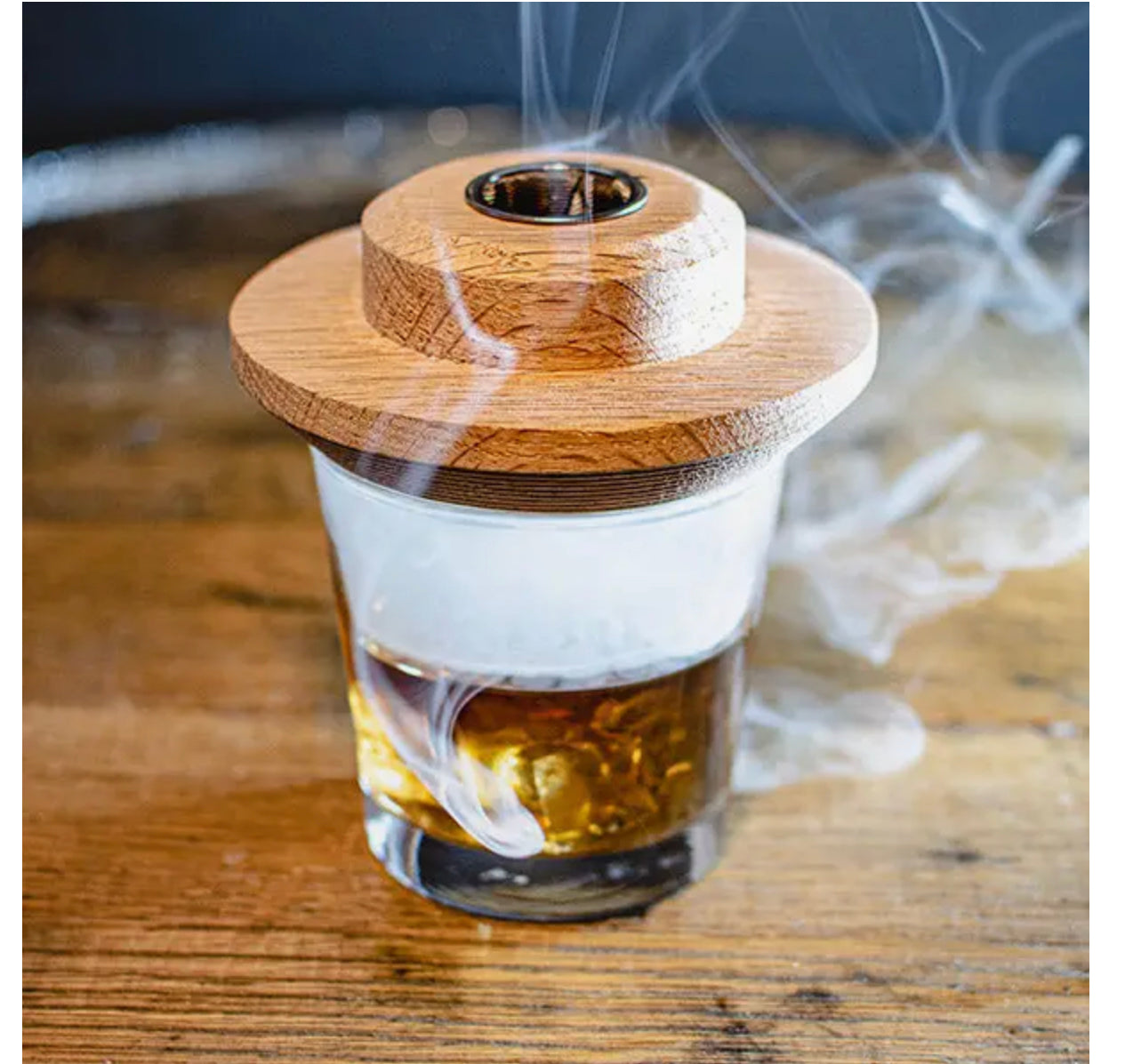 Our Smoke Lid Kit comes complete with an oak cocktail Smoke Lid, wood chips, torch and butane. The Smoke Lid is a drink smoker which is simple to use, takes little space at your bar, and is designed with the character bourbon and whiskey lovers appreciate.  Simply add a pinch of wood flakes, burn with the provided torch, and let rest for a few seconds.   * Kit includes Smoke Top, wood chips, culinary torch, and butane.  *Many cocktail smoking kits require butane, but do not include it.  Our does, so it is ready-to-use on arrival. * Perfect for smoking whiskey, bourbon, old fashioneds, manhattans, or whatever drink your heart desires. * Tapered lid is designed to fit various size cocktail glasses, including rocks, Glen Cairn, coupe, manhattan, and more.  * Our compact four-burner torch pushes high heat instantly on the chips. * The product contents come packaged in a gift box for a great presentation.
