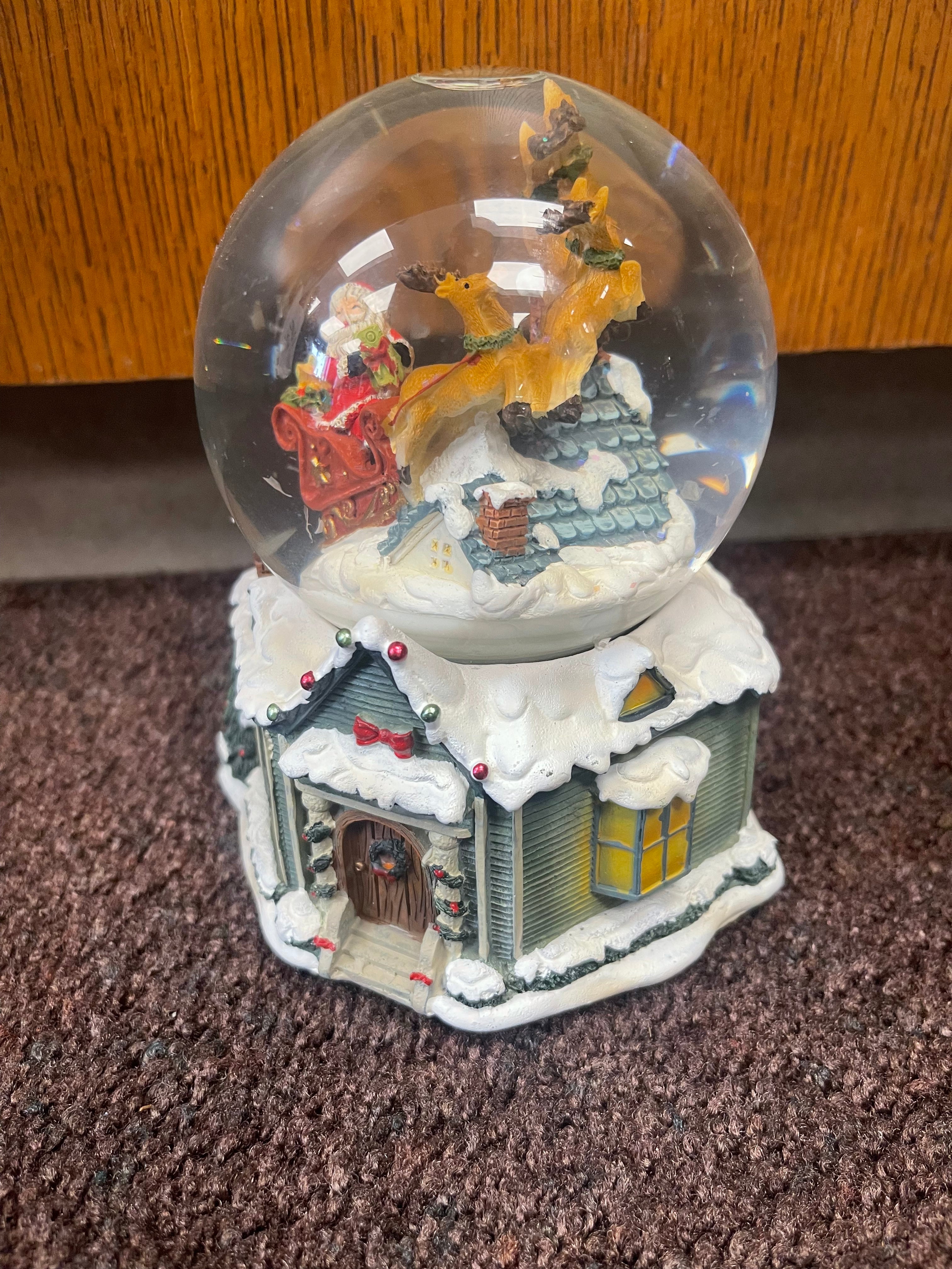 Beautiful musical Snow globe has Santa and his reindeer launching off a rotating roof while jingle bells plays. Measures 6’ tall x 5.25’ wide. Wind up mechanism for music.