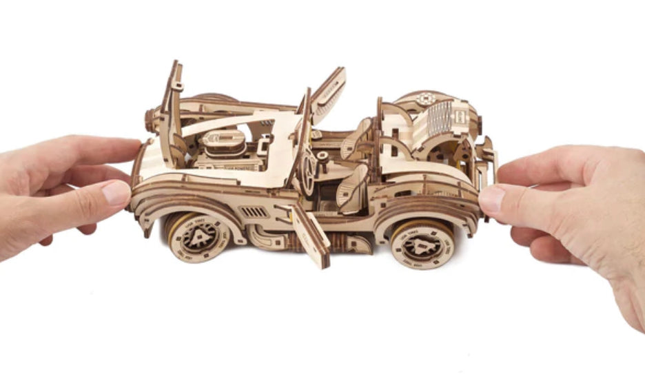 We think this 3D puzzle / DIY model is a beauty, with its fat tires, bulging curves (thanks to pieces that are precision laser-cut into fine 1mm plywood), a big open mouth up front, and open-air convertible design. This wooden car's moving parts include turning front wheels, doors that open, and a hood and trunk that can be raised. Instead of a rubber band motor we've used a powerful spring mechanism to provide the "muscle" in this racer and extend the model's usable life. The ratchet mechanism means you don't have to hold the knob the entire time you're winding the model—potential energy is stored with each twist, without slippage, until the strong internal spring is fully loaded.