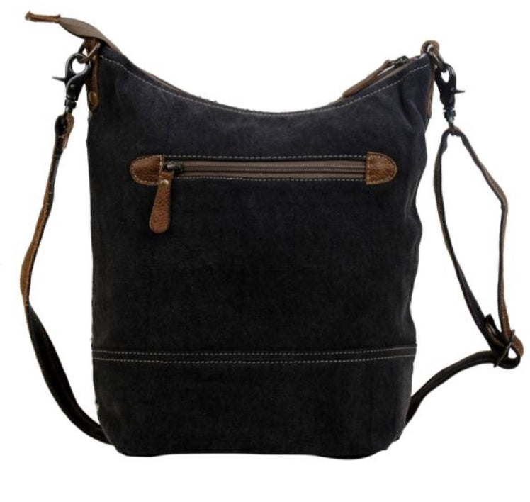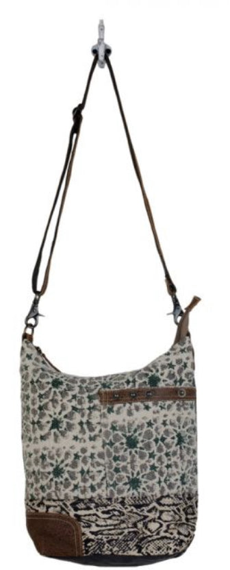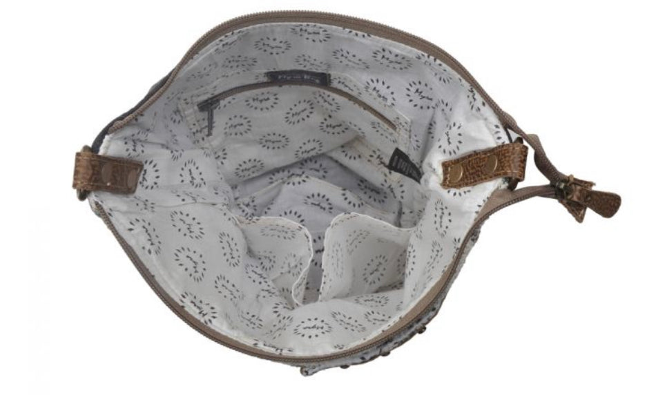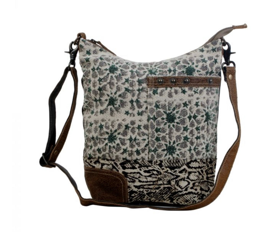 This shoulder bag has an exotic design in the front and is intricately textured. With multiple pockets and zippered back, this bag will allow the neat organization of essentials.