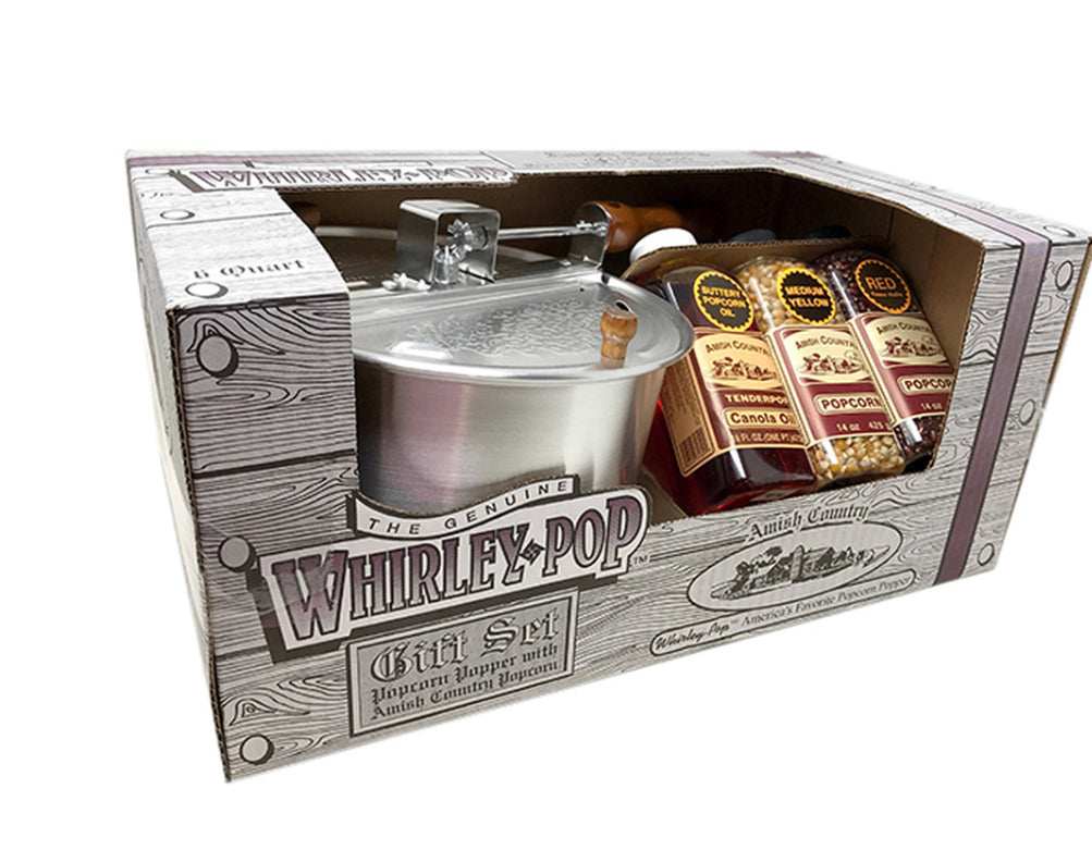 This Gift Set comes with a Whirley Pop popper and 3 bottles of popcorn! The popper stirs popcorn in the bottom of the pan by a crank at the end of the handle. Can be used on any stove. Take it camping with you too!