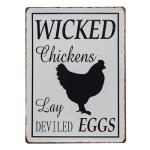 Wicked Chickens Plaque is a metal sign with a humorous design that is perfect for any kitchen or dining room. Item features the silhouette of a hen with the phrase, "Wicked Chickens Lay Deviled Eggs." Sign hangs on two sawtooth hangers and measures 13¾" high by 10" wide.
