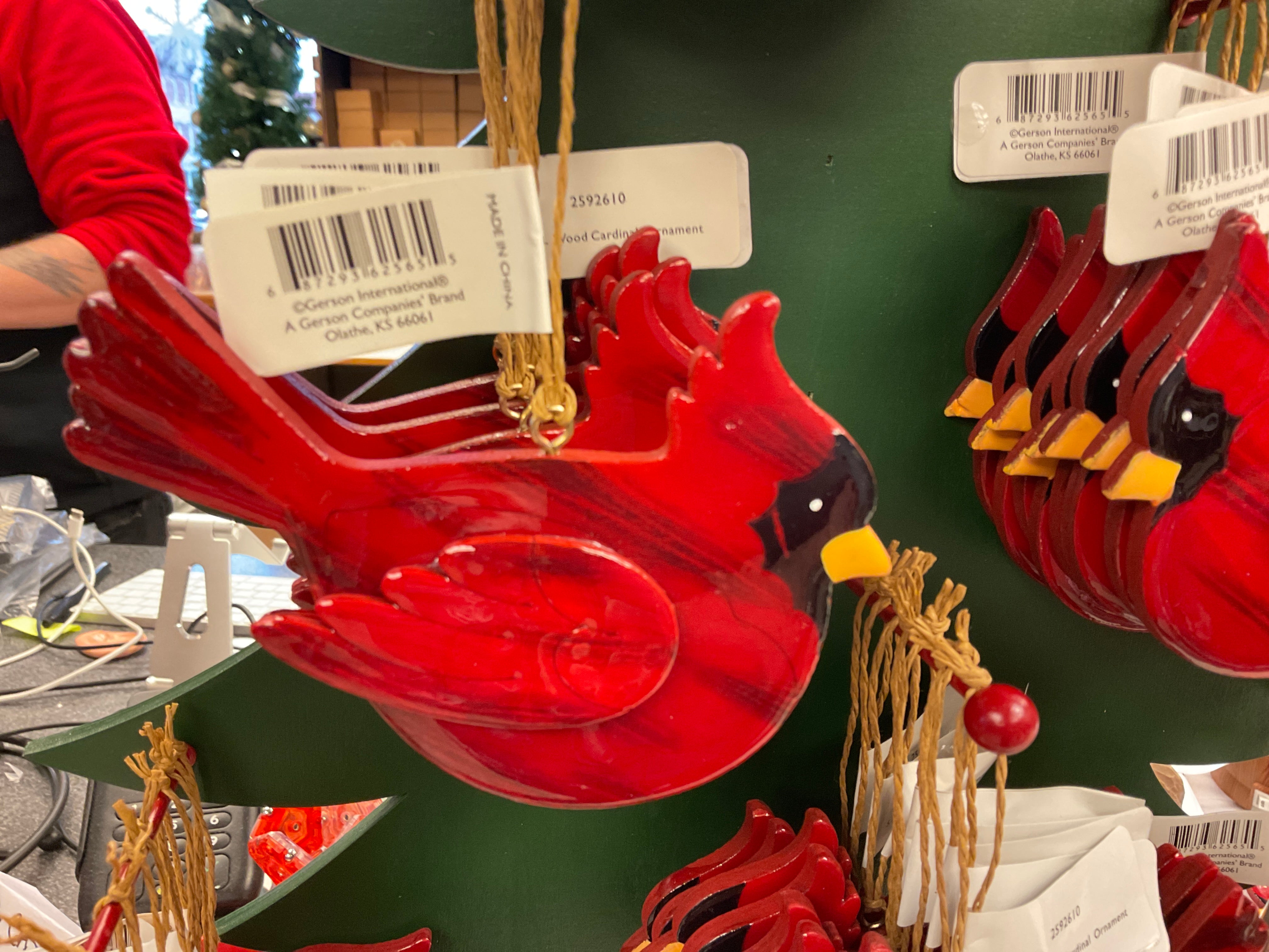 Adorable wood Cardinal Ornament. 5.1” Long with coated jute hanger.