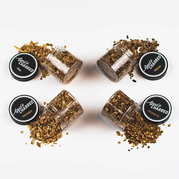 Our Bold Wood Chip Four Pack includes four unique wood types: pecan, mesquite, hickory, and oak.  Each type of wood provides a unique flavor and aroma for your cocktail. * Each container is 2oz which provides enough wood chips to infuse over 100 cocktails; That's 400+ bold and smokey cocktails! * The wood type options of pecan, mesquite, hickory, and oak offer a perfect flavor variety to pair with various whiskey, bourbon, and rum cocktails * Each container includes a silica pack to keep the wood free of moisture so it is ready to burn quickly * Wood chips from Aged & Charred are optimally sized for burning efficiently and creating a rich plume of smoke