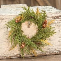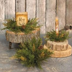 Prickly Pine Candle Ring has many realistic pine branches that come together to form a ring attached to a natural fine twig base. The ends of some of these branches have begun to yellow, and  there are several different-sized pinecones are scattered throughout. Measures 4” inside diameter and 10" outside diameter.