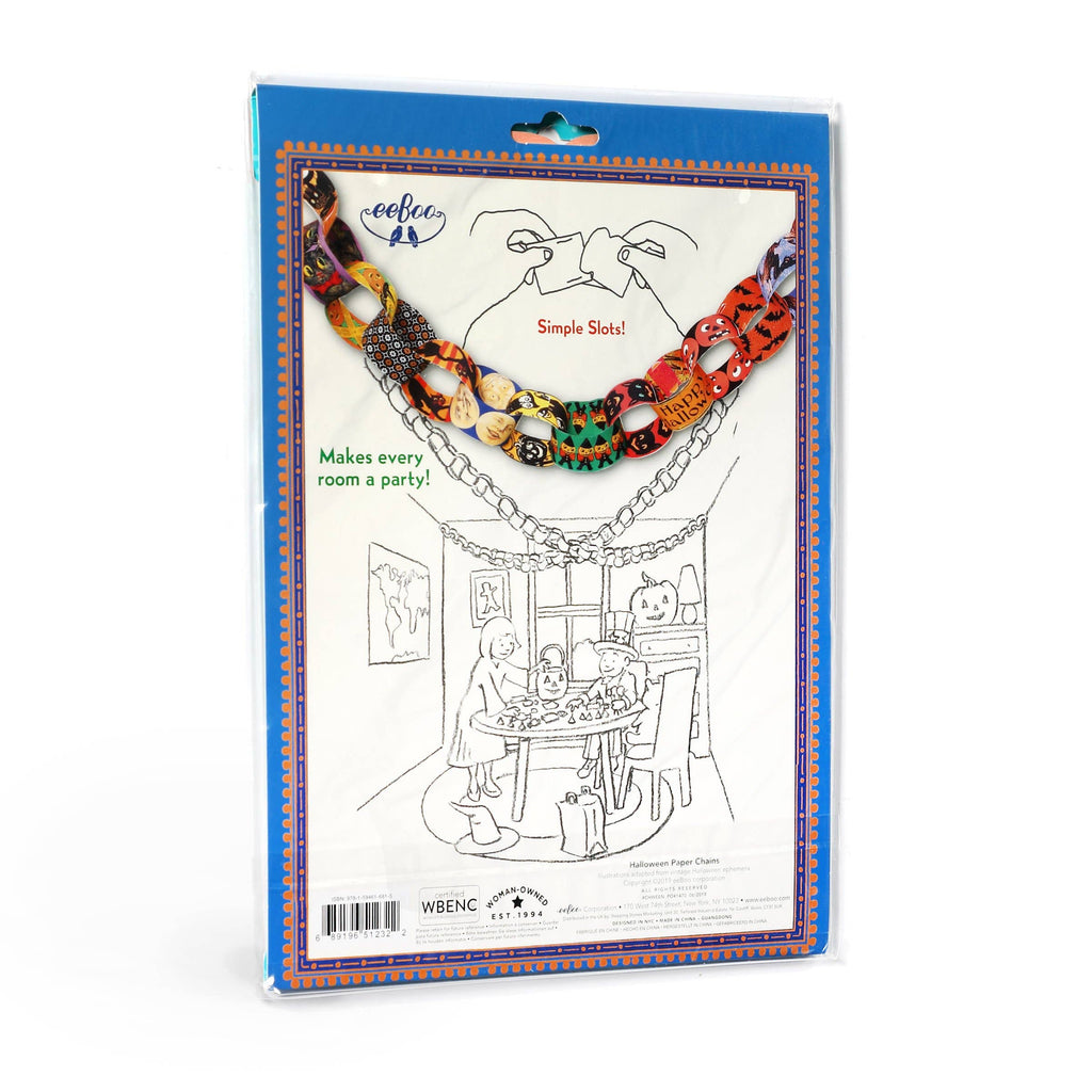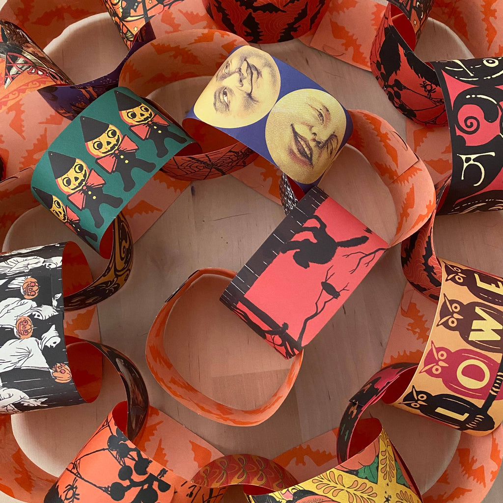 Assortment of Illustrations adapted from vintage Halloween ephemera inspired paper chains. •Ages: 5+ •Finished chain is 24' and 120 links •No Glue needed! •A fun family activity