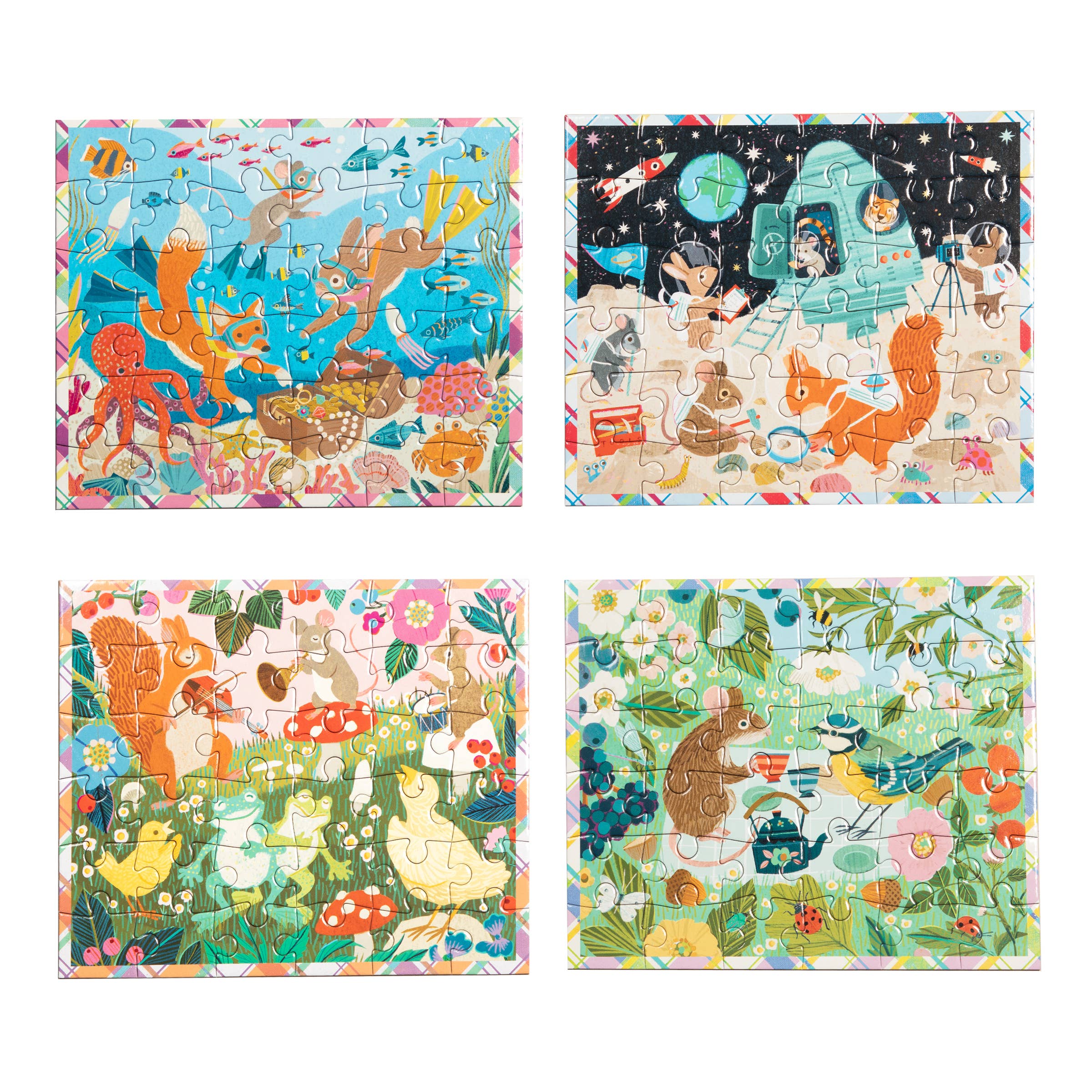 Embark on a pocket-sized adventure with eeBoo’s mini 36 piece jigsaw puzzles. These four mini puzzles feature whimsical animal artwork from Victoria Ball. Sweet animals at a tea party, discovering an underwater treasure, visiting the moon and happy dancing! This assortment of 16 miniature puzzles arrives in a self-contained display box, containing 4 each of 4 styles.