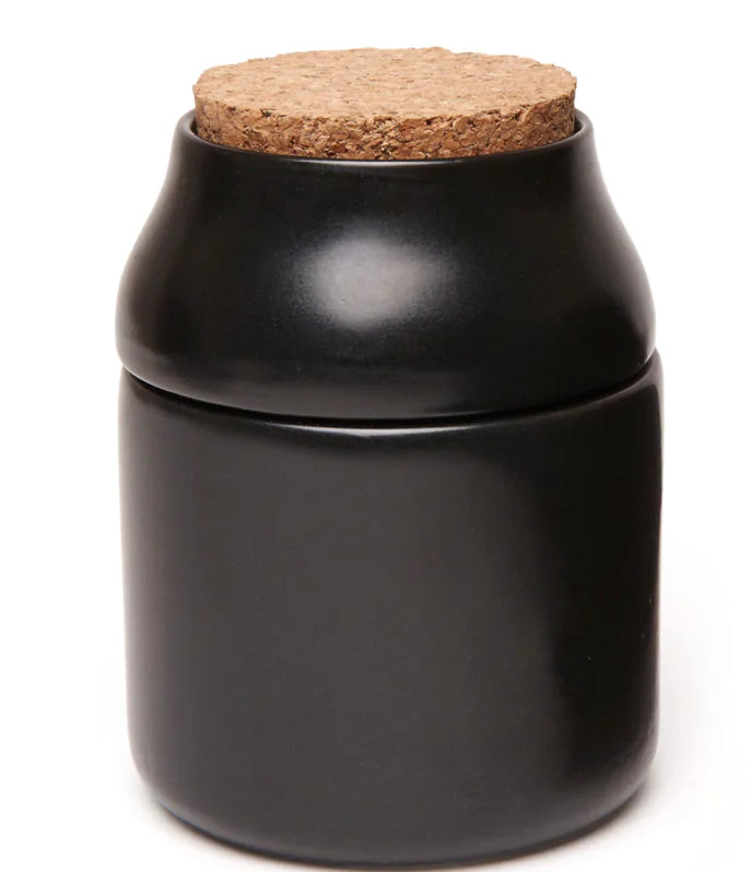 Sleek ceramic herb grinder with top storage compartment and cork stopper.