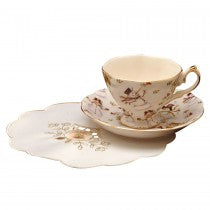 6 ounce Scallop Edge Tea Cup Saucer. Cream Porcelain. Metallic Decal with Gold Trimmed. Set of 4